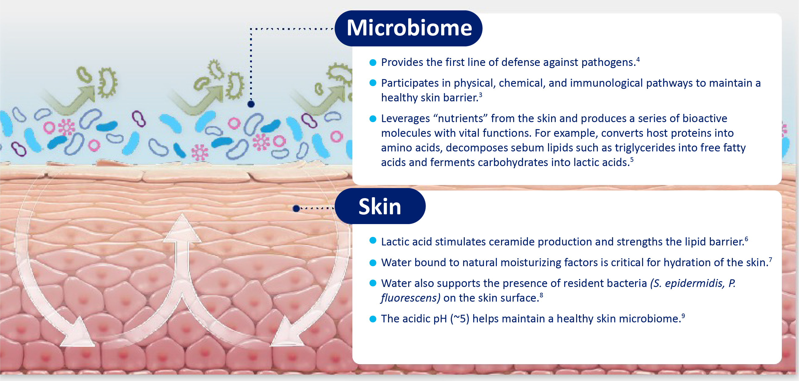 The skin microbiome and the skin relate symbiotically to affect each other in physical, chemical, & immunological ways.3