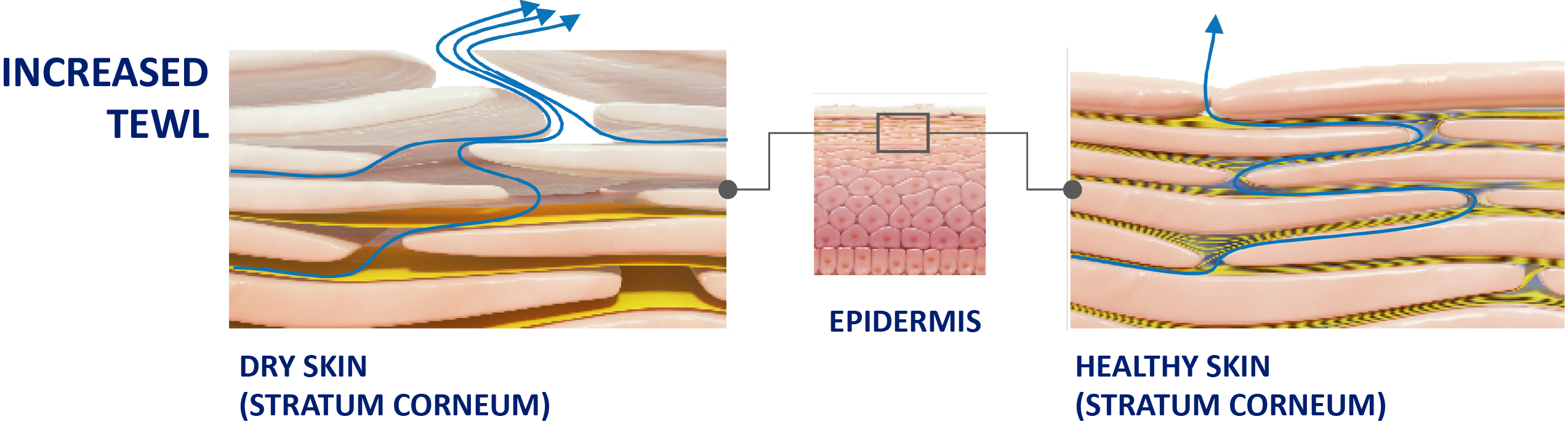 When the skin barrier is damaged, the water exchange regulation system becomes destabilised, and water migrates more easily to the outside, increasing transepidermal water loss (TEWL).