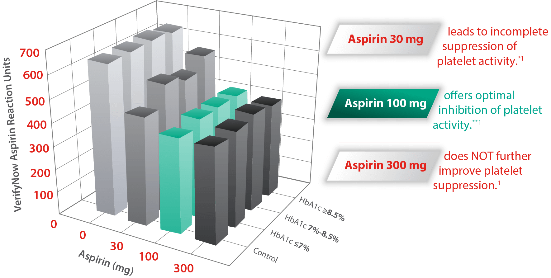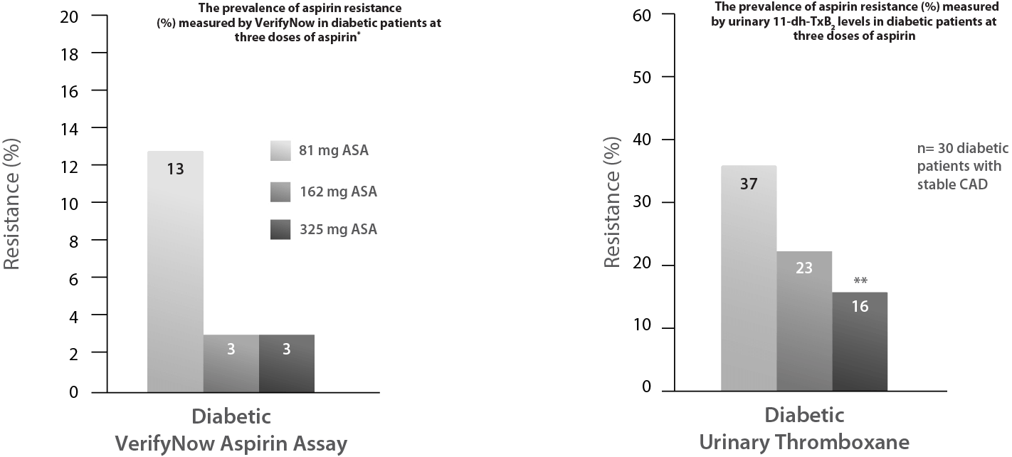 The ASPECT study showed that 162 and 325 mg aspirin significantly reduced urinary 11-dh-TXB2 levels compared with 81 mg aspirin in diabetic patients (p=0.01 and 0.002, respectively).3