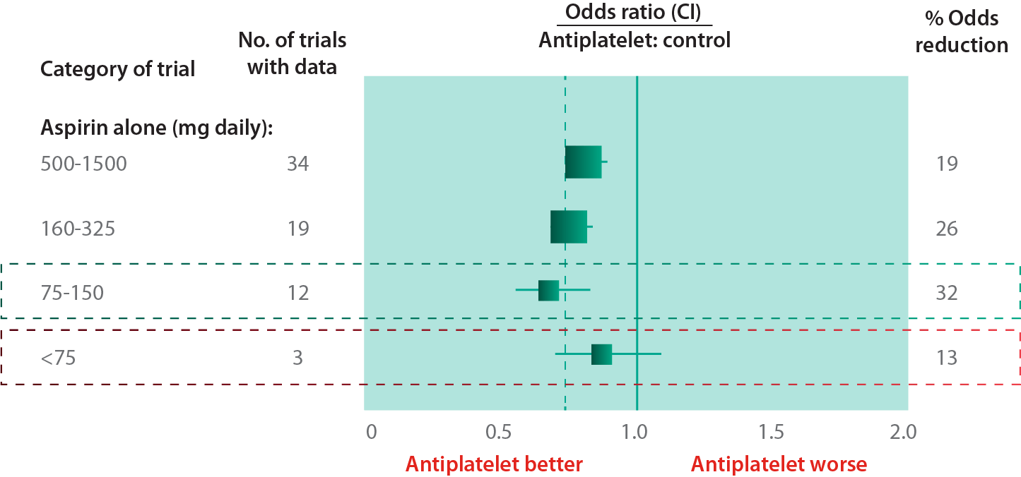 A meta-analysis of several trials using different doses of aspirin showed that daily doses <75 mg seemed to have a somewhat smaller effect with proportional reduction 13% (p=0.05). 2